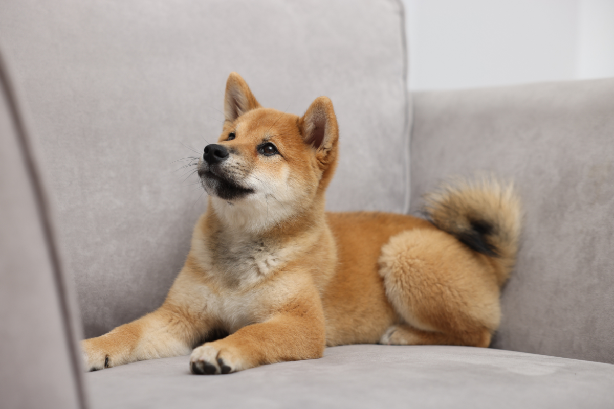 - ピンと立った三角形の耳と、くるりと巻いた巻き尾が特徴的